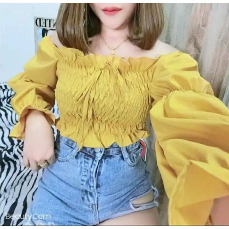 Beverly Baju Sabrina Atasan Wanita Korean Crop Top Blouse Kerut Serut Lengan Panjang Jumbo Sabrina Shopee Indonesia